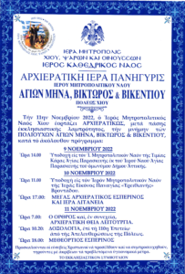 Την 11ην Νοεμβρίου 2022, ο ΙερΌς Μητροπολιτικός Ναός Χίου εορτάζει ΑΡΧΙΕΡΑΤΙΚΩΣ, μετα πάσης εκκλησιαστικής λαμπρότητος, την μνήμην των ΠΟΛΙΟΥΧΩΝ ΑΓΙΩΝ ΜΗΝΑ, ΒΙΚΤΩΡΟΣ& ΒΙΚΕΝΤΙΟΥ, κατά το ακόλουθον πρόγραμμα: