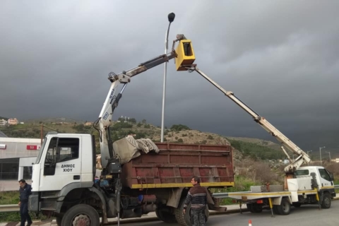 Αντικατάσταση φωτιστικού σώματος μετά από τροχαίο ατύχημα από τον Δήμο Χίου