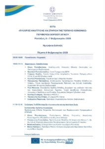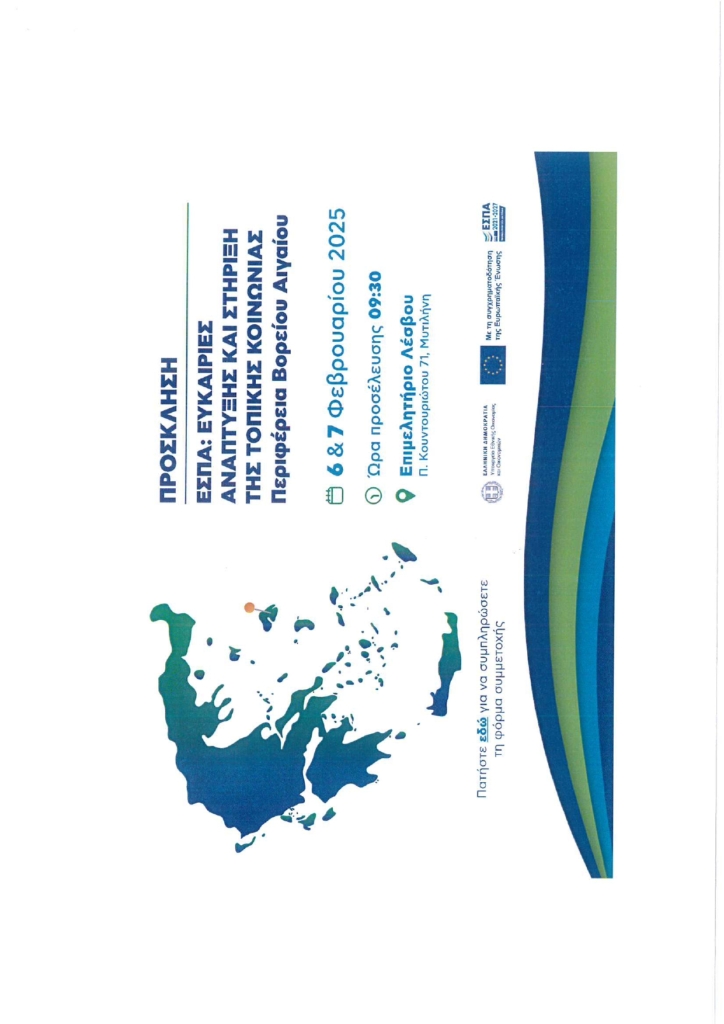 Το Υπουργείο Εθνικής Οικονομίας και Οικονομικών/Γενική γραμματεία ΕΣΠΑ με την συνεργασία της Περιφέρειας Βορείου Αιγαίου οργανώνει στη Μυτιλήνη στις 6 και 7.2.2025 στο Αμφιθέατρο του Επιμελητηρίου Λέσβου την διημερίδα ΕΣΠΑ-ΕΥΚΑΙΡΙΕΣ ΑΝΑΠΤΥΞΗΣ ΚΑΙ ΣΤΗΡΙΞΗ ΤΗΣ ΤΟΠΙΚΗΣ ΚΟΙΝΩΝΙΑΣ Περιφέρεια Βορείου Αιγαίου.