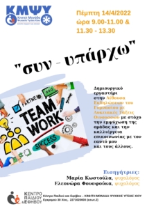 Η Κινητή Μονάδα Ψυχικής Υγείας Χίου του Κέντρου Παιδιού και Εφήβου διοργανώνει δημιουργικό εργαστήρι για τους μαθητές που φοιτούν στο Γυμνάσιο Οινουσσών και στο Γυμνάσιο με Λυκειακές τάξεις Οινουσσών.