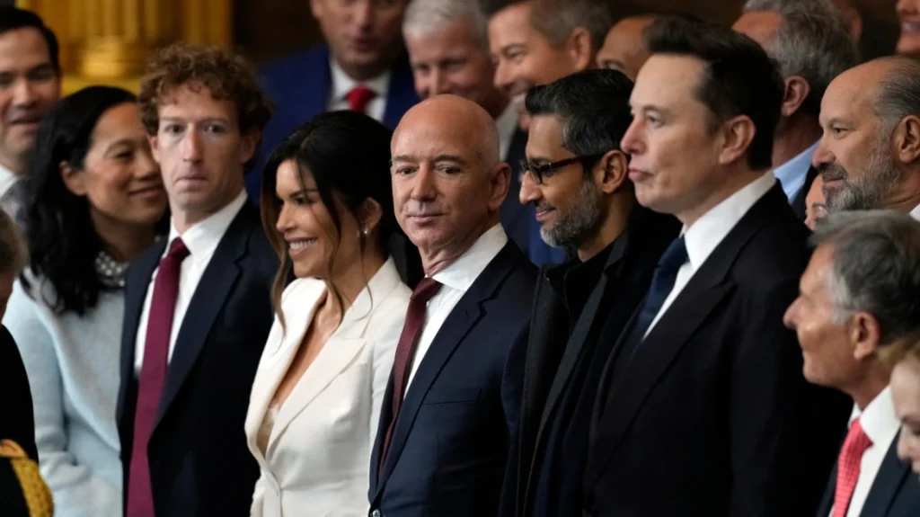 Στην ορκωμοσία του νέου προέδρου, από τις εικόνες που ξεχώρισαν ήταν η συγκέντρωση δισεκατομμυρίων σε ένα πλάνο, με Έλον Μασκ, Τζεφ Μπέζος και Μαρκ Ζούκερμπεργκ να κάθονται δίπλα δίπλα με τις συνοδούς τους. Με μια συνολική καθαρή αξία $911 δισ., το «τρίο» συγκέντρωσε την προσοχή – και μάλιστα είχε καλύτερες θέσεις από το νέο υπουργικό συμβούλιο. Η στενή φυσική και πολιτική τους παρουσία δίπλα στον Τραμπ προκάλεσε έντονες ανησυχίες για τον ρόλο που θα μπορούσαν να διαδραματίσουν στη διακυβέρνηση της χώρας.