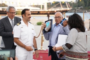Ευτυχής συγκυρία κατά την ξεχωριστή αυτή ημέρα ήταν ο κατάπλους της Πλωτής Έκθεσης «Επανασύστασις 21» στο λιμάνι των Οινουσσών, πρώτο σταθμό του πολυήμερου ταξιδιού σε εμβληματικά για τη συμμετοχή τους στον Εθνικοαπελευθερωτικό Αγώνα νησιά του Αρχιπελάγους.