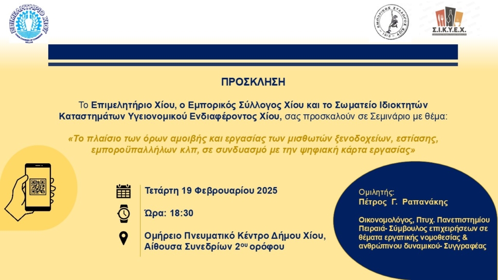 Επιμελητήριο Χίου Διοργάνωση Σεμιναρίου με θέμα: «Το πλαίσιο των όρων αμοιβής και εργασίας των μισθωτών ξενοδοχείων, εστίασης, εμποροϋπαλλήλων κλπ. σε συνδυασμό με την ψηφιακή κάρτα εργασίας»