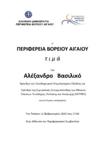 Η Περιφέρεια Βορείου Αιγαίου οργανώνει στις 12 Φεβρουαρίου 2025 εκδήλωση για να τιμήσει τον Αλέξανδρο Βασιλικό, Πρόεδρο του Ξενοδοχειακού Επιμελητηρίου Ελλάδος και Πρόεδρο της Ευρωπαϊκής Συνομοσπονδίας των Εθνικών Ενώσεων Ξενοδοχίας, Εστίασης και Αναψυχής (HOTREC), τον εκ Λήμνου καταγόμενο. Η εκδήλωση θα γίνει στην Αίθουσα του Περιφερειακού Συμβουλίου.