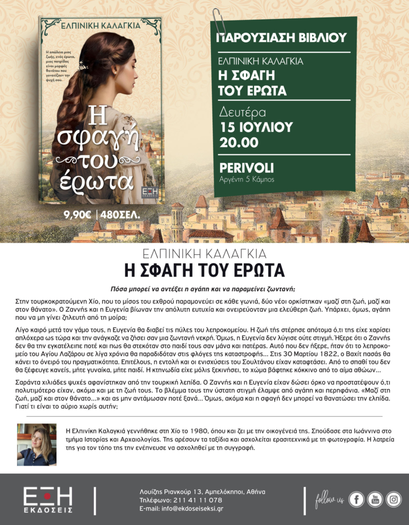 Η παρουσίαση του βιβλίου θα γίνει στο Perivoly στον Κάμπο της Χίου υπό την αιγίδα των Εκδόσεων ΕΞΗ και του βιβλιοπωλείου Πυξίδα τη Δευτέρα 15 Ιουλίου 2024 στις 20:00.