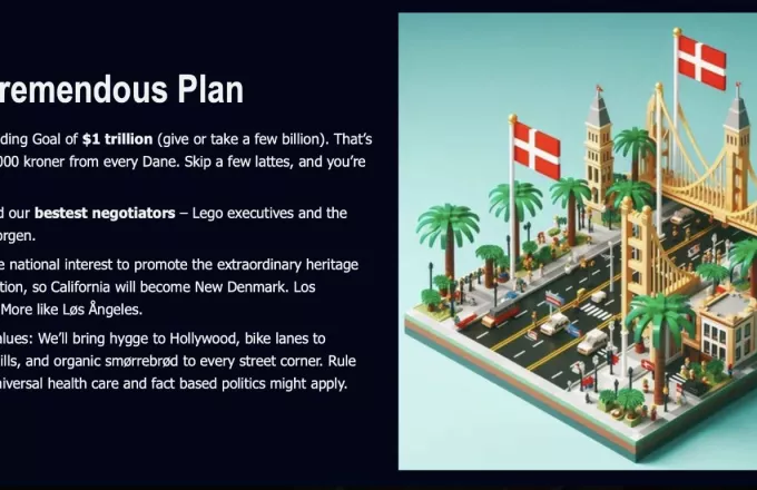 Το «τρομερό σχέδιο» (Tremendous Plan) εξαγοράς της αμερικανικής, ηλιόλουστης πολιτείας προτείνει να αγοράσουν οι Δανοί την Καλιφόρνια για  1 τρισεκατομμύριο δολάρια και μια «προσφορά δανέζικων αρτοσκευασμάτων »- πολύ λιγότερο από το ΑΕΠ των 4 τρισεκατομμυρίων δολαρίων της Καλιφόρνια το 2024.