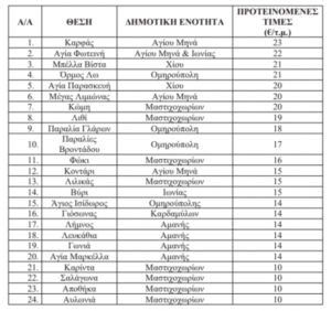 Ο καθορισμός του ανταλλάγματος ανά τετραγωνικό μέτρο της απλής χρήσης αιγιαλού βάσει της αριθ. ΚΥΑ 47458 ΕΞ 2020 (ΦΕΚ 1864/Β/15-05-2020) όπως τροποποιήθηκε και ισχύει αποφασίστηκε με την 15/2021 (ΑΔΑ: 6ΟΓΝΩΗΝ-Ξ7Ω) απόφαση της Οικονομικής Επιτροπής Δήμου Χίου για δυο (2) έτη και οι προτεινόμενες τιμές έχουν ως εξής: