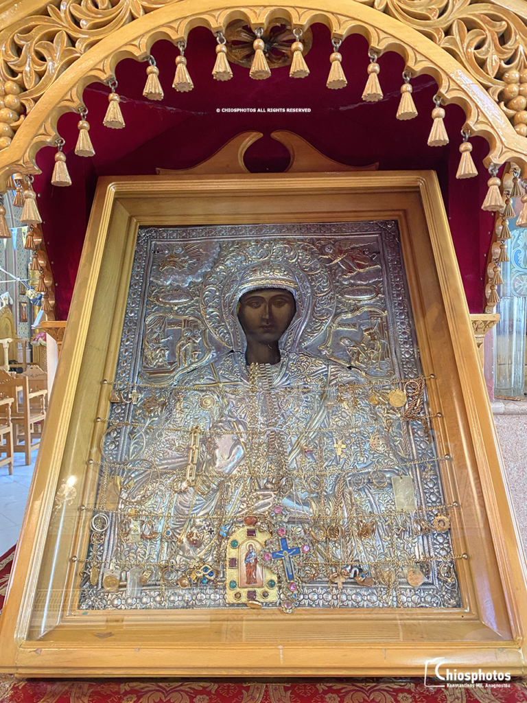 | Εντός του Ναού φυλάσσεται η ιστορική και θαυματουργή εικόνα της Αγίας Παρασκευής, η οποία μεταφέρθηκε στη Χίο από τους πρόσφυγες κατά την Μικρασιατική καταστροφή του 1922. |