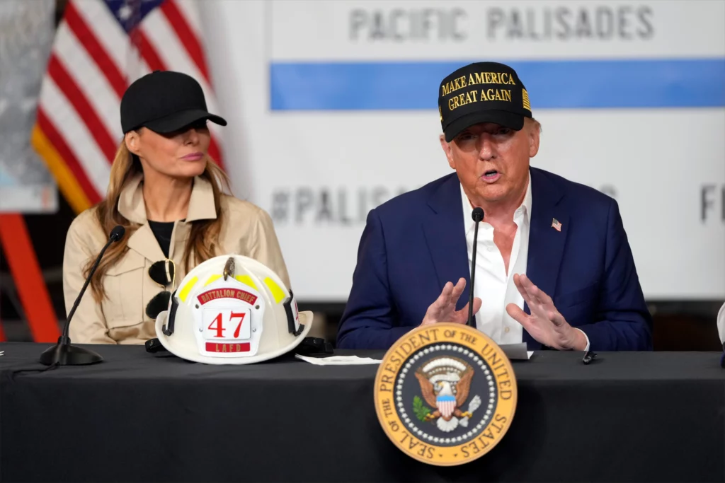 Στο Λος Άντζελες, όπου επιθεώρησε από αέρος τις πληγείσες περιοχές, δεσμεύτηκε να συνεργαστεί για την αποκατάσταση των ζημιών με τον Δημοκρατικό κυβερνήτη της Καλιφόρνιας παρά τη μεταξύ τους αντιπαλότητα το προηγούμενο χρονικό διάστημα. Όμως, λίγο αργότερα και μετά την περιήγησή του στις κατεστραμμένες περιοχές, άφησε να εννοηθεί πως δεν θα βοηθήσει στην ανοικοδόμηση του Λος Άντζελες, αν η Καλιφόρνια δεν υπακούσει στην κυβέρνησή του, ενώ είχε έναν έντονο διάλογο με τη δήμαρχο της πόλης, ζητώντας της να κινηθεί πιο γρήγορα.