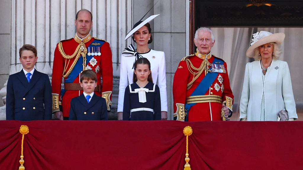 Οι εικόνες έδειχναν την πριγκίπισσα της Ουαλίας να φτάνει στο παλάτι του Μπάκιγχαμ με τα τρία της παιδιά, τον πρίγκιπα Γεώργιο, 10 ετών, την πριγκίπισσα Σαρλότ, 9 ετών, και τον πρίγκιπα Λούι, 6 ετών, πριν από την παρέλαση για τα γενέθλια του βασιλιά.